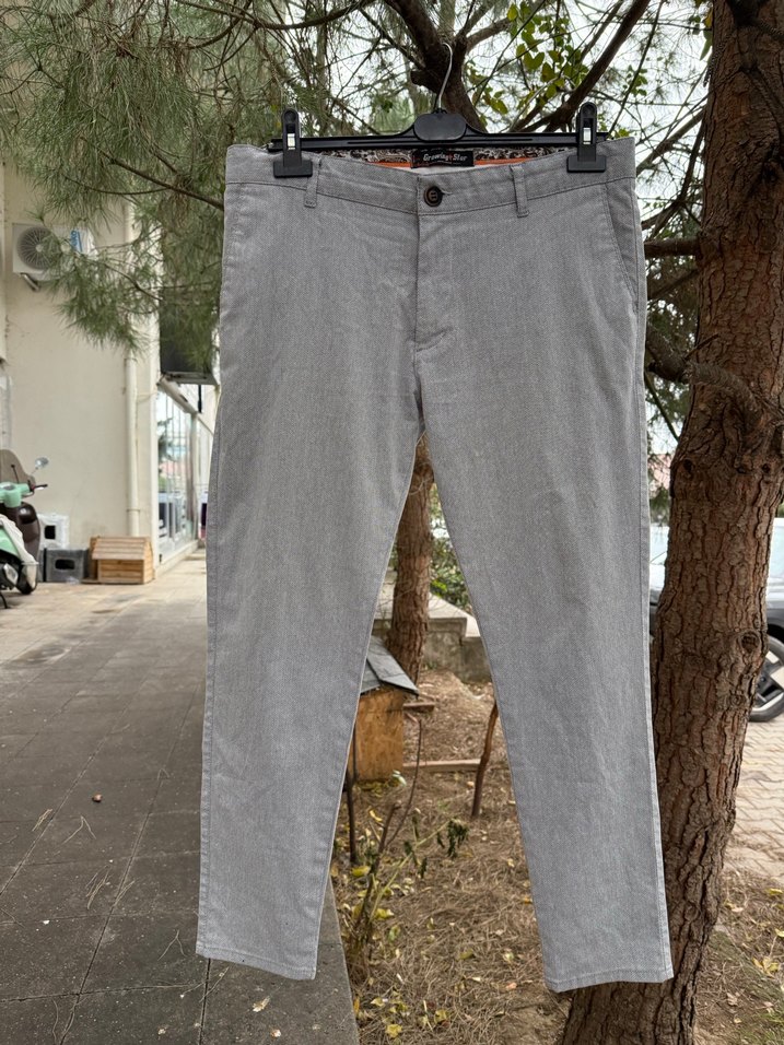 Gri keten kumaştan, kemerli ve midi boy regular fit erkek pantolon. Dış mekan kullanımı için uygundur.