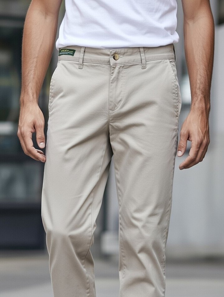 Hafif sert sentetik kumaştan, bej renkte regular fit erkek pantolon. Rahat sokak stiliyle dış mekan kullanımı için uygundur. ️