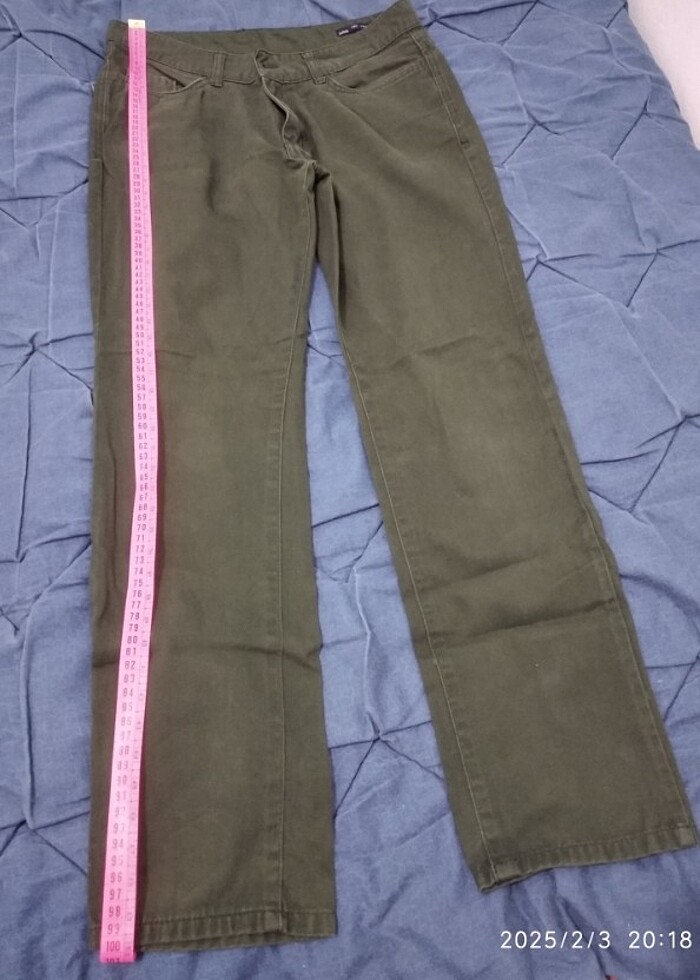 Erkek pantolon, koyu yeşil,herhangi bir yırtığı söküğü lekesi yok.beden29/32 ve boy ölçüsü,markası fotoğrafta görünüyor.bacak boyu 73cm ,paça 18cm
