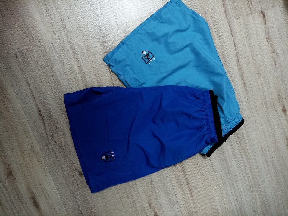 Parlak mavi renkte, rahat kesim erkek mini spor şortu. Düz tasarıma küçük logo detayı eşlik eder.
