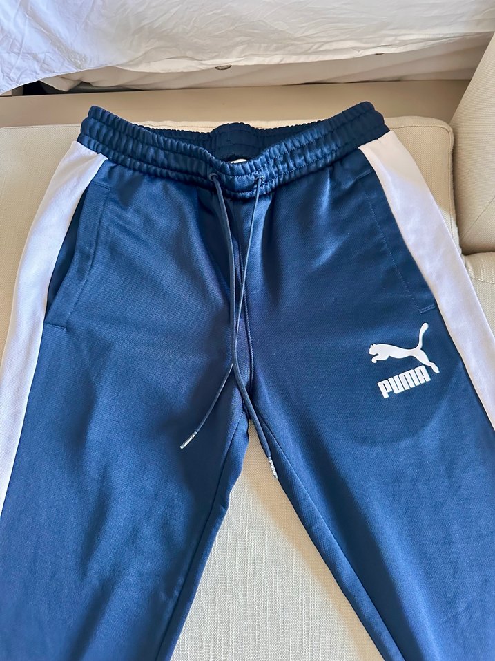 Parlak mavi ve beyaz yan şeritli, fermuarlı cepli, yumuşak kumaştan Puma erkek eşofman altı. Trendy ve rahat stil için uygundur. Boyu 98 cm, beli 38 cm’dir. Lastikli bel olduğu için 2-3 cm daha esner. Çok temiz ve sorunsuz.