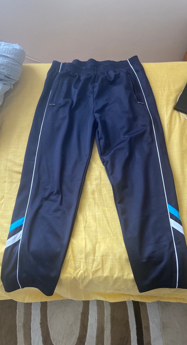 Parlak mavi renkte, fermuarlı cepli, sentetik kumaştan yapılmış erkek rahat eşofman altı. Dizinde çok hafif kusuru var. Belirttim görselde.