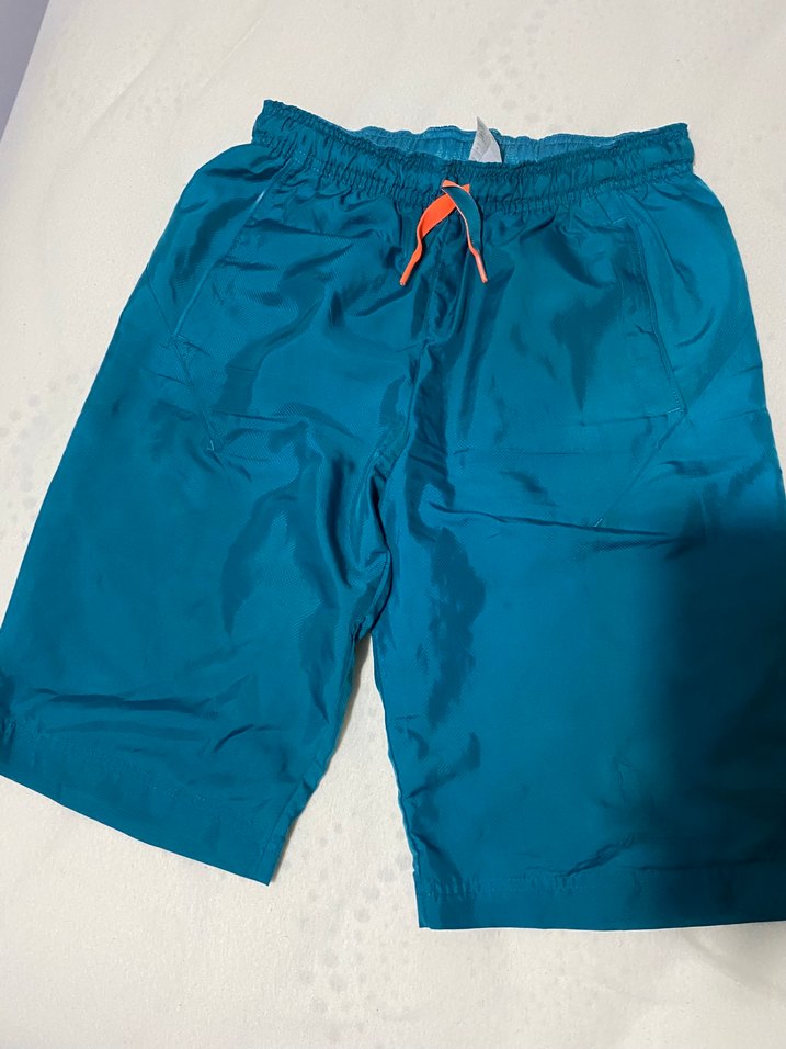 Parlak mavi renkte, bol kesim erkek yüzme şortu. Elastik bel ve bağcık detaylı, desen içermeyen sade tasarım.
