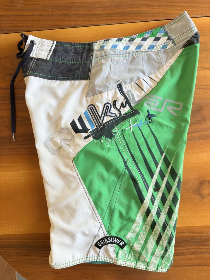 Parlak yeşil ve beyaz renklerde, cepli, Quiksilver marka erkek bol kesim şort. Sokak stiline uygun, plaj için ideal. s-m uyumludur