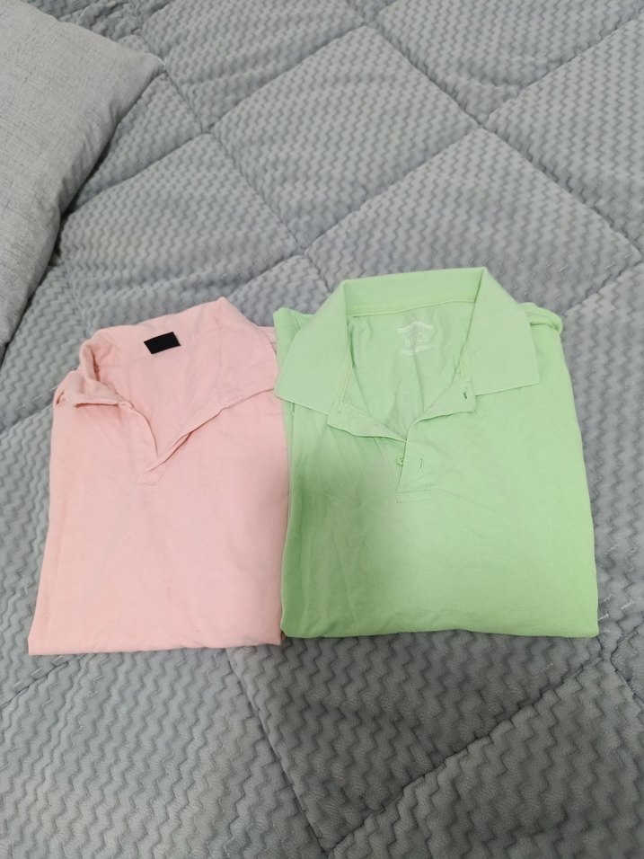 Pamuklu, yakalı ve kısa kollu, rahat kesimli erkek polo tişörtleri, pastel pembe ve yeşil renklerde, günlük kullanıma uygun.