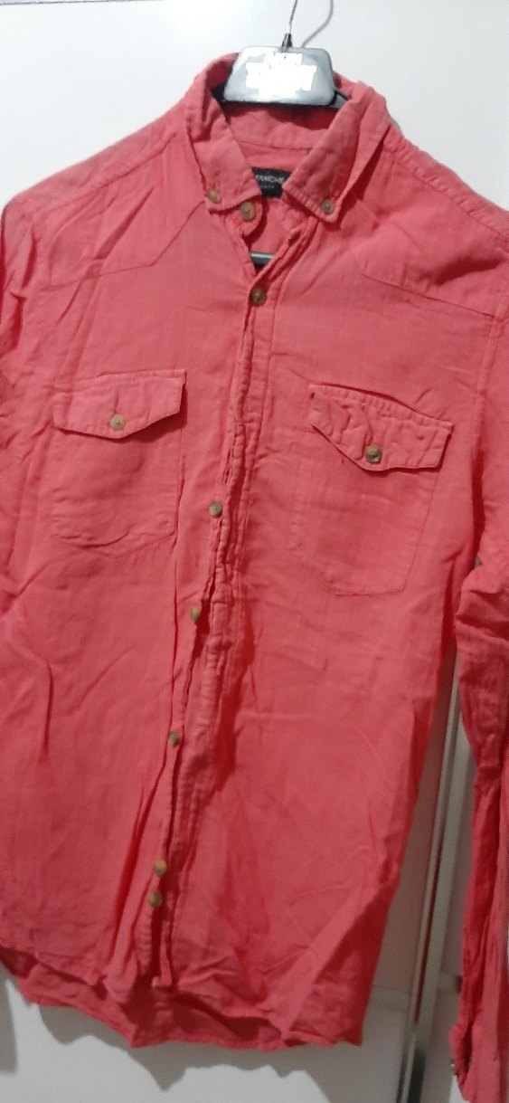 Erkekler için pembe keten gömlek, düğmeli ve uzun kolludur. Salaş kesimi ve yakalı tasarımıyla günlük sokak stiline uygundur.