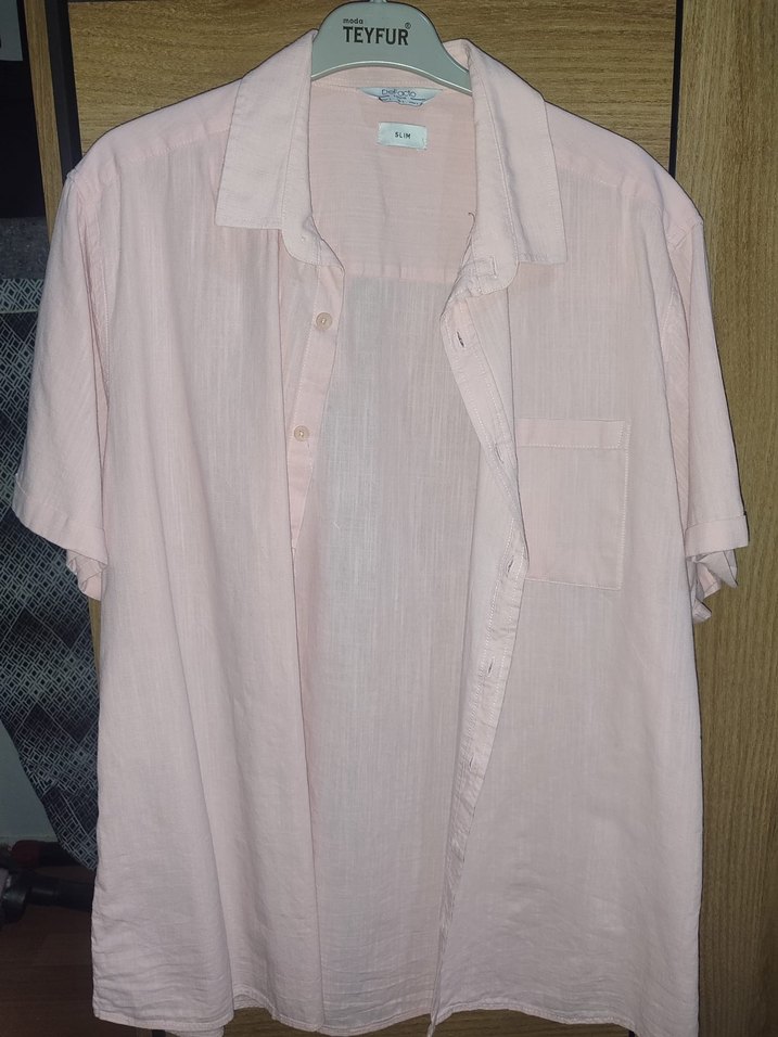 Pembe keten kumaştan, kısa kollu, düğmeli ve cepli, rahat kesim erkek gömleği. Sokak stiline uygun basic tasarım. ☀️