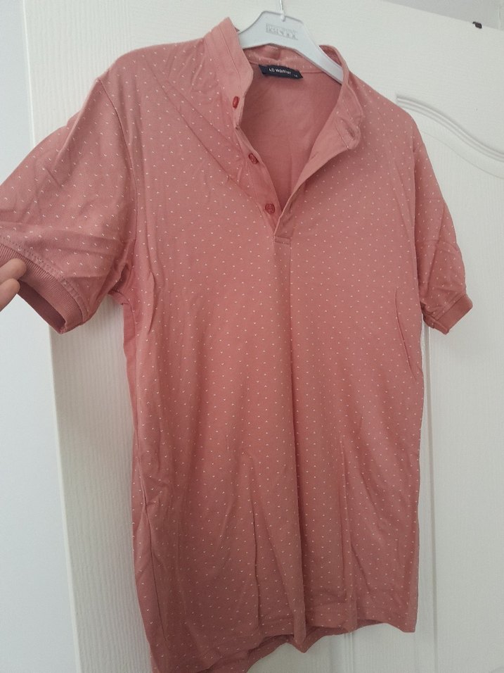 Hic giyilmedi Erkekler için keten kumaştan yapılmış, düğmeli ve yakalı, kısa kollu, bol kesim pembe pastel renkli polo tişört. Sokak stiline uygun rahat bir parça.