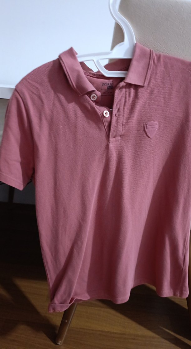 Pamuk kumaştan yapılmış, düğmeli yakalı ve fitted kesime sahip erkek pembe polo tişört. Pastel tonlarda, günlük sokak giyimine uygun.