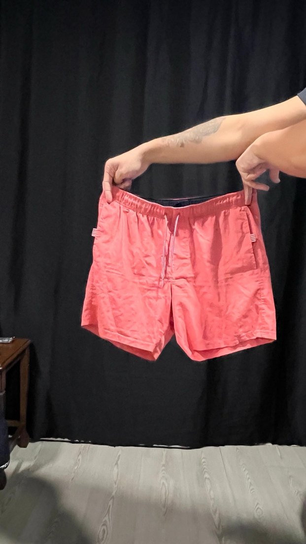 Erkekler için rahat kesim, pastel pembe renkli mayo şortları, midi boyda ve desen içermeyen sade tasarımıyla plajda şık bir görünüm sunar.
