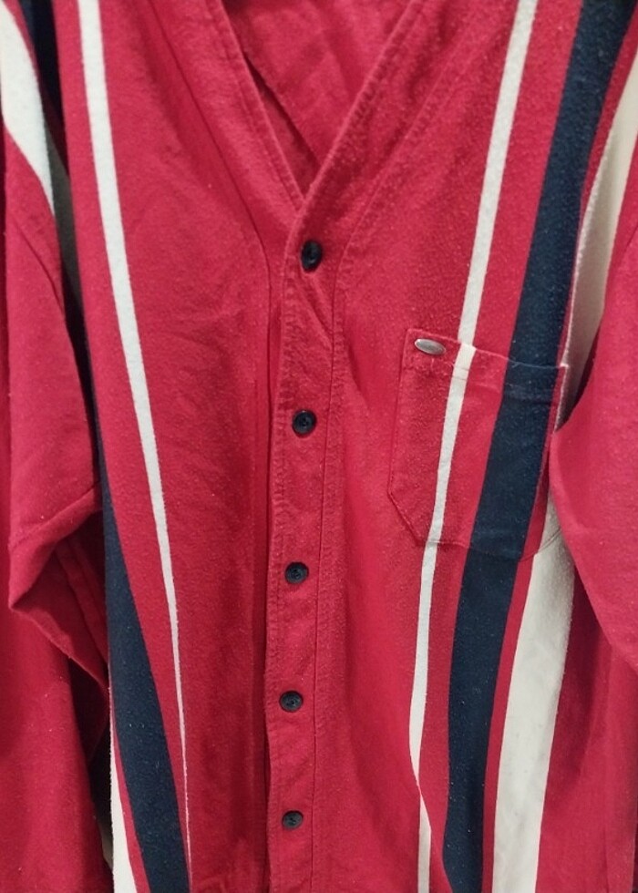 Senfoni marka , erkek ,Xl ,uzunkollu, önden düğmeli ,yaka cepli , bordo renkte, ön tarafı lacivert ,krem çizgili desenli defosuz , kullanılmış penye pijama üstü.yaka kısminda biraz pütürlenme, tüylenme var.