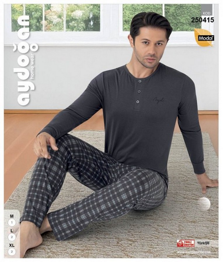 AYDOĞAN 250415 ERKEK MODAL U.KOL PİJAMA TAKIM AYDOĞAN Gri ekose desenli pantolon ve düğmeli yuvarlak yaka uzun kollu üstten oluşan, rahat kesim erkek pijama takımı. Rahat ve günlük kullanıma uygun.