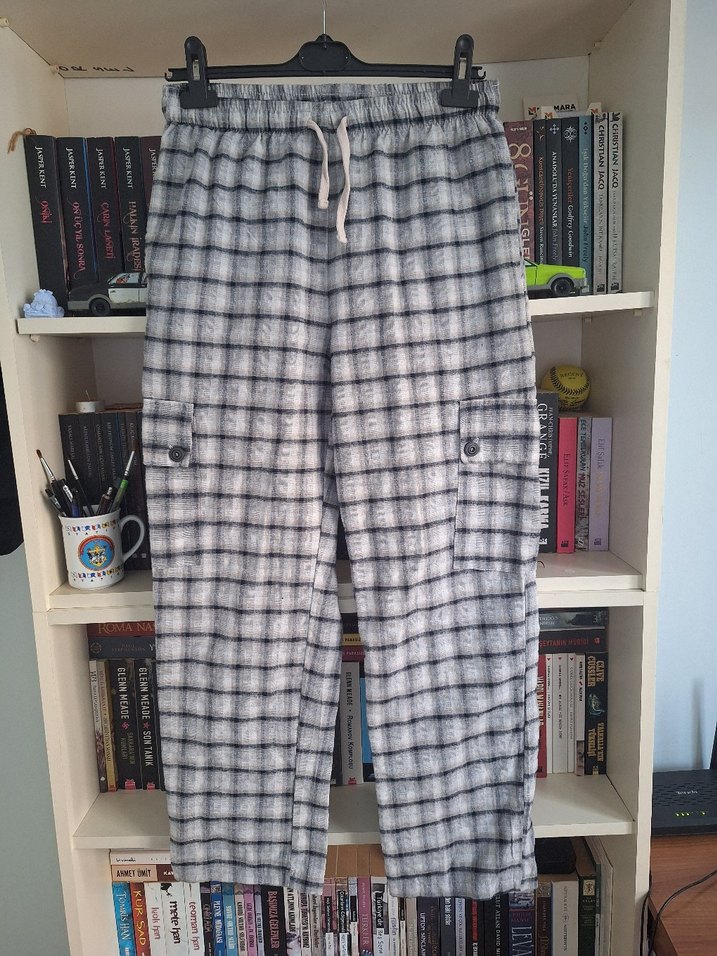Gri ekose desenli, düğmeli cepli ve lastikli bel bantlı rahat erkek pijama altı, konforlu ve günlük tarzda.