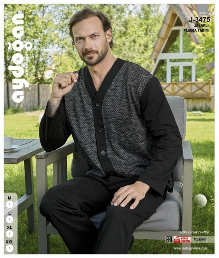 AYDOĞAN 3475 ERKEK JAKARLI O ACIK U.KOL PİJAMA TAKIM Düğmeli, siyah erkek pijama takımı, normal boy ve uzun kolludur. Notched lapel yakası rahat bir görünüm sunar.