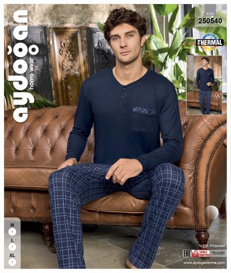 AYDOĞAN 250540 ERKEK THERMAL PATLI U.KOL PJ TAKIM Lacivert uzun kollu, düğmeli üst ve kareli pantolonlu erkek pijama takımı. Yuvarlak yaka ve rahat kesimlidir.