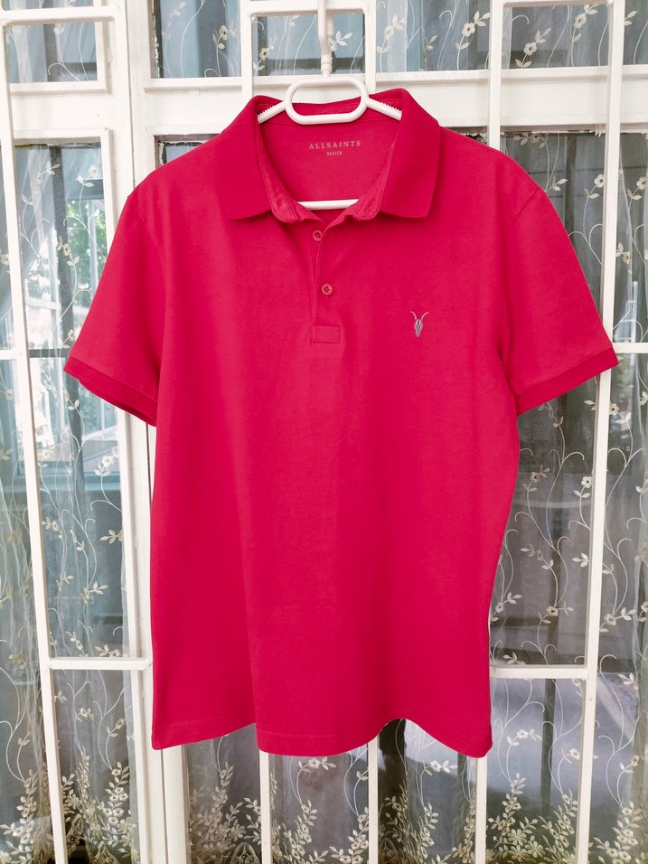 All saints marka, M beden, kırmızı renk, yeniden farksız kusursuz, erkek polo yaka t-shirt.