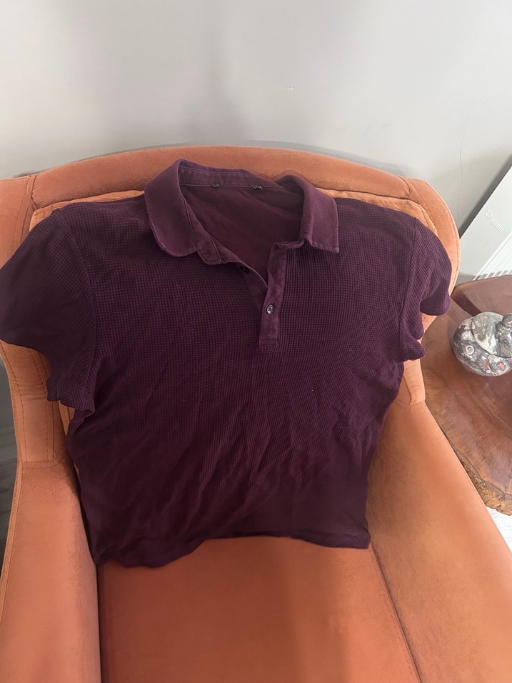 Bordo renkli, kısa kollu, düğmeli polo yaka tişört, rahattır. Az kullanıldı. Sorunsuzdur. Etiketi kesik ama L bedendir.