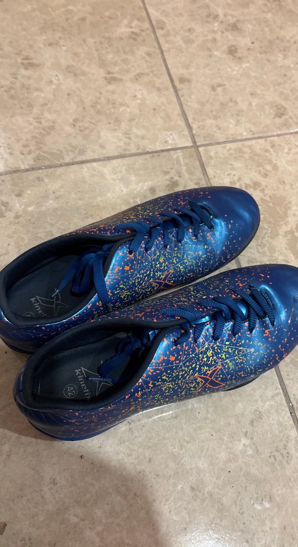Canlı renkli, bağcıklı ve cırt cırtlı erkek futbol ayakkabısı, kauçuk tabanlı, spor ve sokak tarzı için uygun.