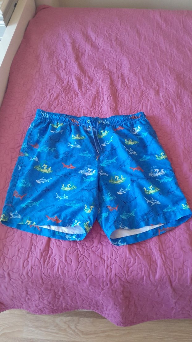 Renkli bağlamalı desenli, elastik bel kısmı ve bağcığı olan mavi erkek mayo şortu. Yaz yüzmeleri için uygun.