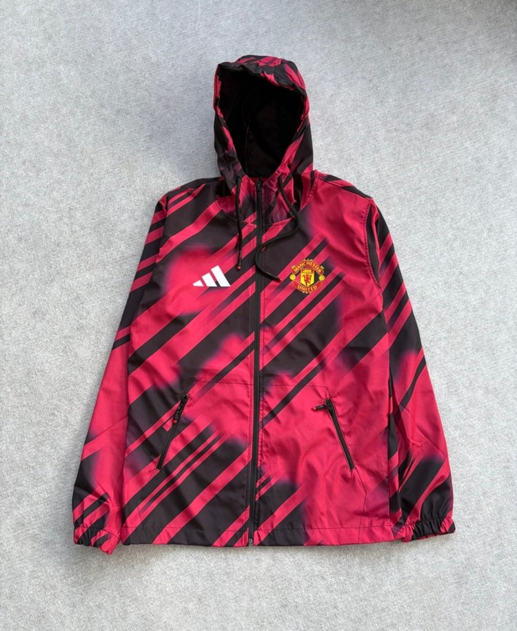 Erkekler için renkli kırmızı-siyah batik desenli, kapüşonlu ve fermuarlı cepli yağmurluk. Uzun kollu, bol kesim, dış mekan kullanımı için uygundur. ️