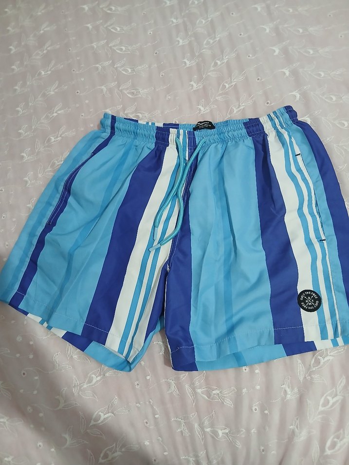 Canlı mavi tonlarında, pilili detaylı ve çizgili desenli, rahat kesim erkek şort mayo. Plaj ve sokak stiline uygun.ölçüleri resimlerde mevcut