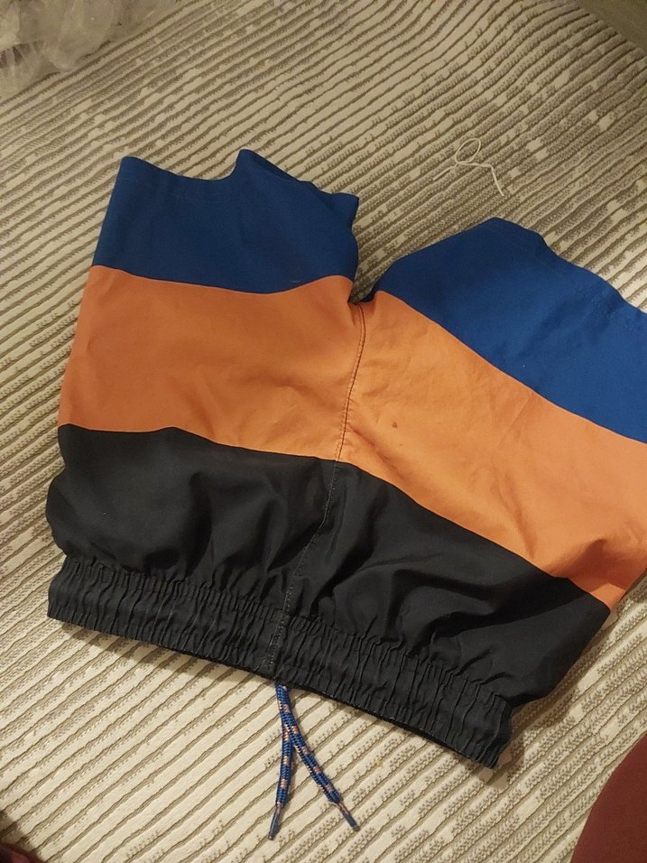 Rahat kesim erkek yüzme şortu, pileli tasarım ve mavi, kahverengi, siyah renk bloklu. Kısa boy, plaj için uygun.