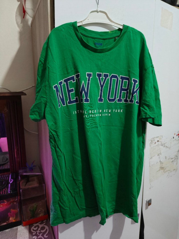 Renkli New York baskılı, kısa kollu, yuvarlak yaka, bol kesim erkek tişörtü.