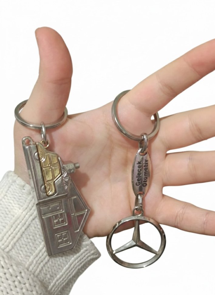 Vintage araba ve altın renk Mercedes amblemi içeren metal iki anahtarlıktan oluşan set. Bohem ve retro tarzı yansıtıyor.