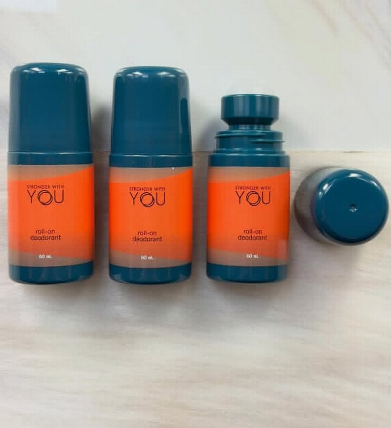 Erkekler için canlı turuncu renkte roll-on deodorant, etkili koku koruması ve kolay uygulama sağlar. Üzerinde 'STRENGTHER WITH YOU' yazısı bulunur.