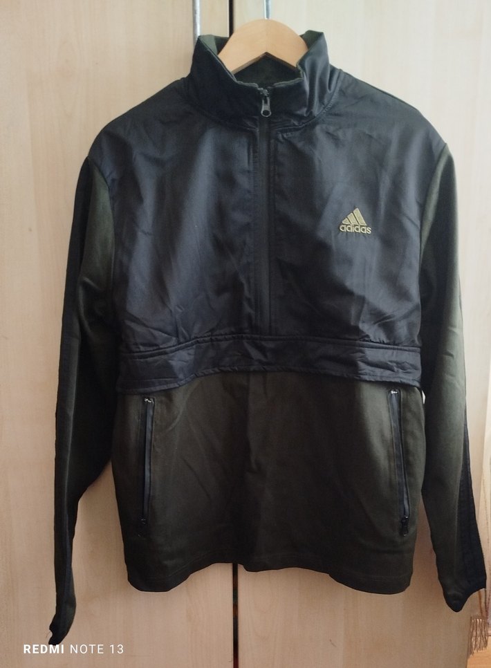 Adidas siyah/haki erkek kısa fermuarlı rüzgarlık, yüksek yakalı ve uzun kollu. Yumuşak fleece kumaştan, bol kesim ve normal boyda, dış mekan için uygun.