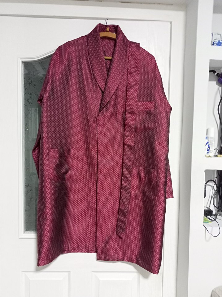 Bordo renkli, parlak dokulu,Kuşaklı cepli iki kol arası 62 cm uzunluk 101 cm hiç kullanılmadı pijama takımı pamuklu kumaştır