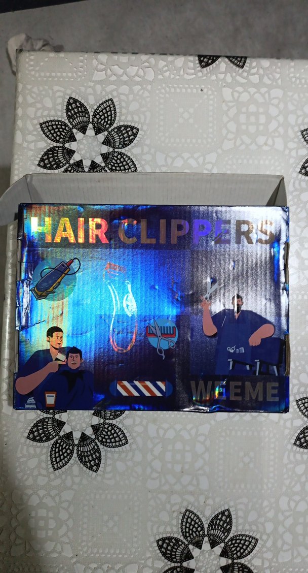 Erkek saç kesme makinesi seti, kutusunda çeşitli tıraş ve bakım çizimleri ile. Saçları kesmek ve şekillendirmek için tasarlanmıştır. ✂️