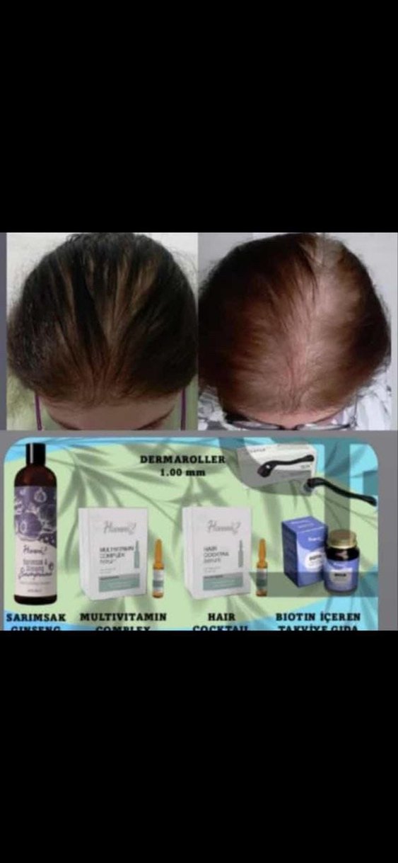 1.00 mm dermaroller, multivitamin kompleksi, sarımsak özütü, saç serumu ve biotin içeren takviyeden oluşan erkek saç bakım seti.