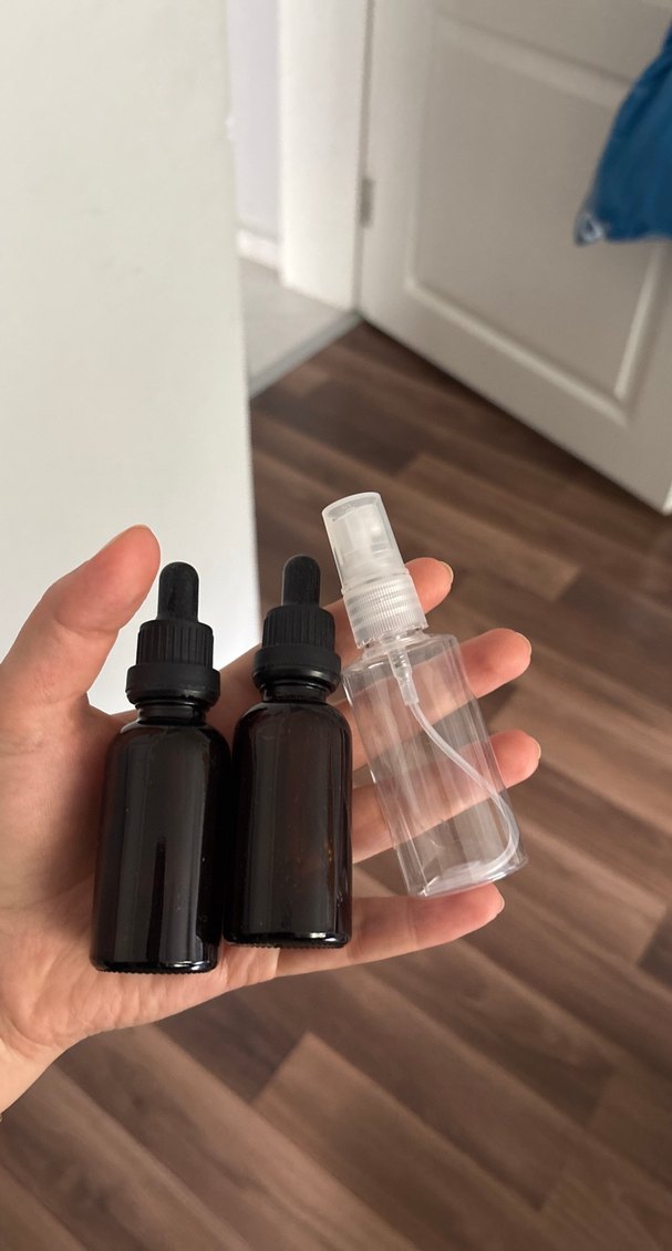 Erkek saç serumu ve sprey uygulamaları için iki koyu cam damlalıklı şişe ve bir şeffaf sprey şişesi içerir.