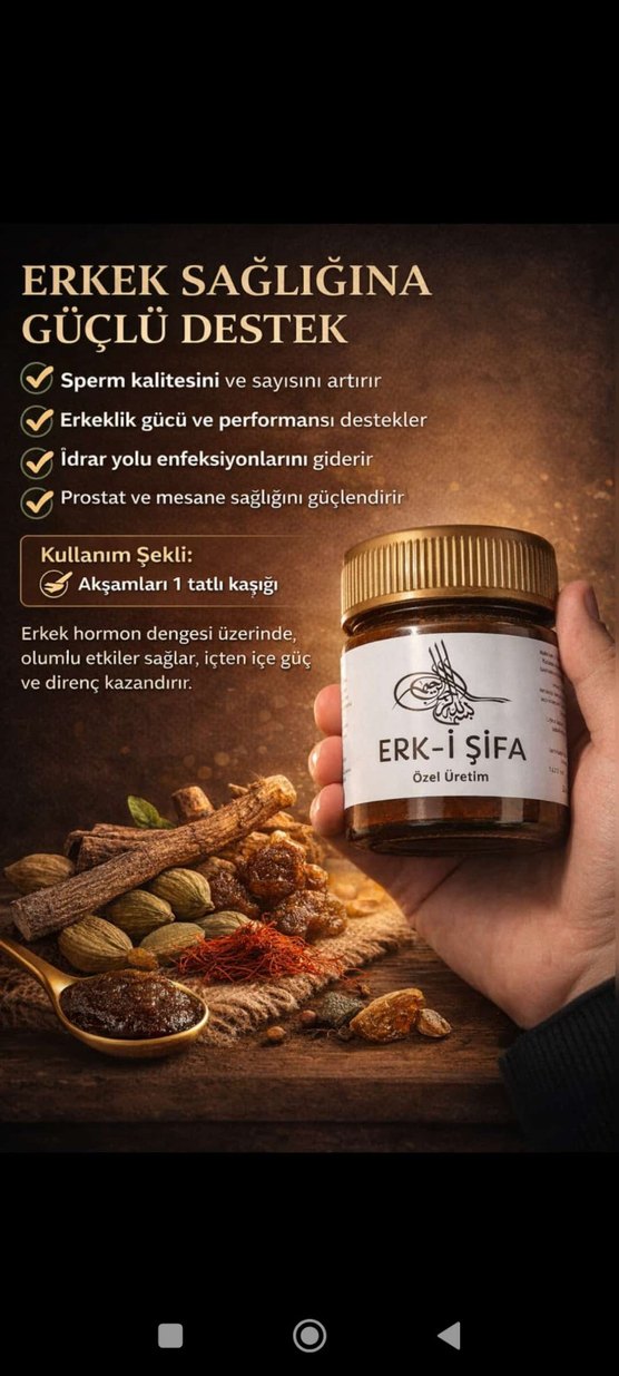 ERK-İ ŞİFA balmı, sperm kalitesi ve sayısını artırır, erkeklik gücü ve performansı destekler, idrar yolu enfeksiyonlarını giderir, prostat ve mesane sağlığını güçlendirir. Akşamları 1 tatlı kaşığı kullanılır.