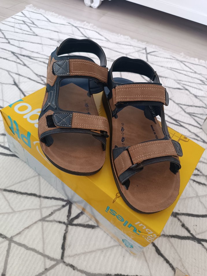 Ayarlanabilir tokaları olan kahverengi erkek outdoor sandaletleri, dayanıklı kauçuktan üretilmiştir. Rahat ve günlük sokak stili için uygundur.