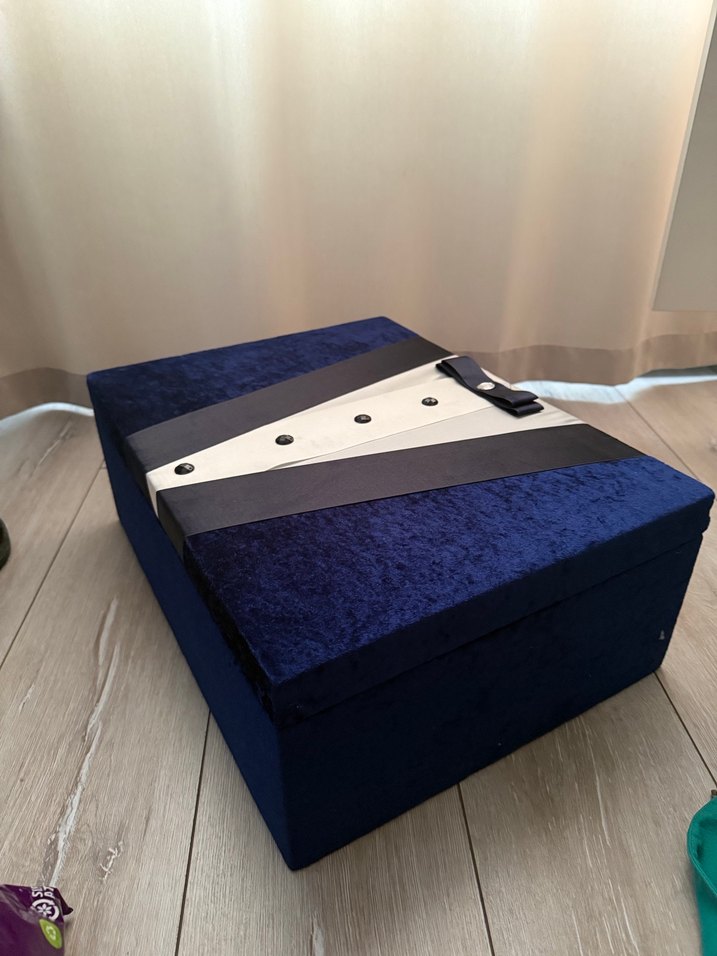 Koyu mavi renkte, desenli ve tokalı kayışlı bu erkek sandığı, büyük ve orta boy