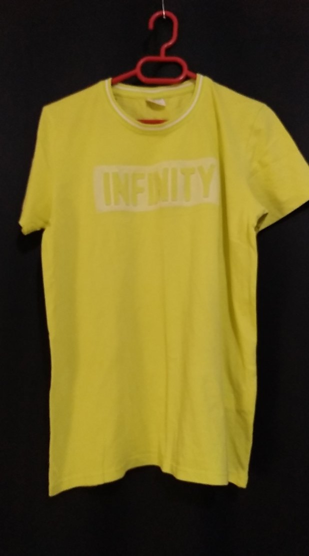 Bu sarı erkek tişörtü, dar kesim, yuvarlak yaka ve kısa kolludur. Canlı renkli sentetik kumaş üzerine "INFINITY" baskısı ile rahat ve şık bir görünüm sunar.