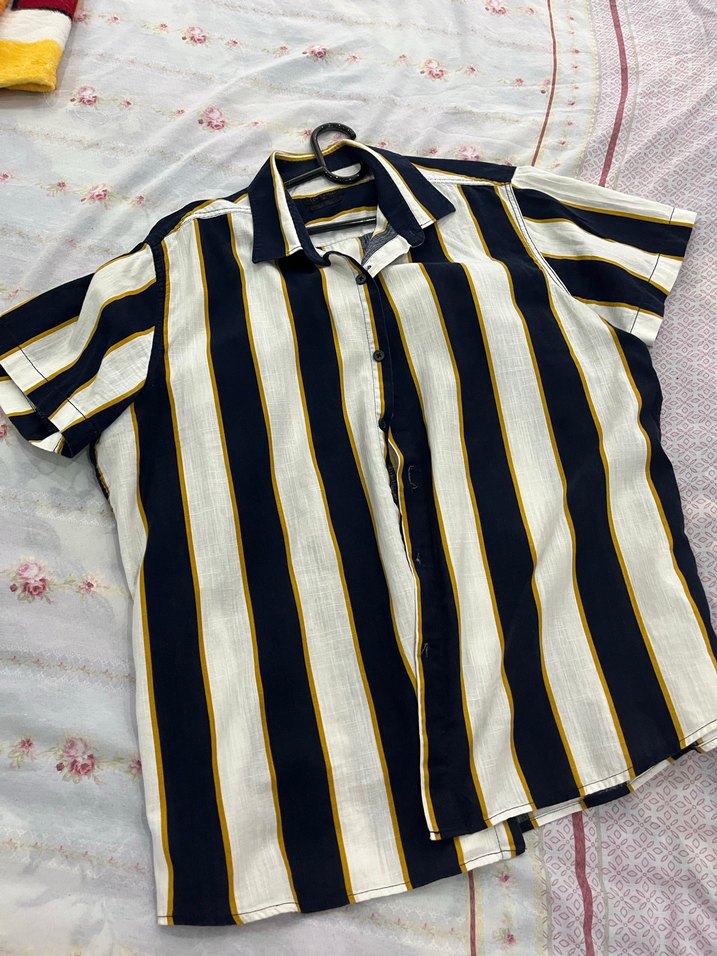 Erkekler için sarı ve siyah çizgili, kısa kollu, düğmeli, yakalı ve bol kesim sentetik kumaştan gömlek. Günlük rahat stil için uygundur.