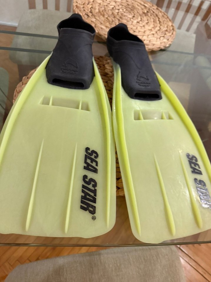 Erkekler için sarı renkte, Velcro bantlı, kauçuk malzemeden üretilmiş deniz ayakkabısı. Plajda kullanılabilir, üzerlerinde SEA STAR yazısı bulunur.