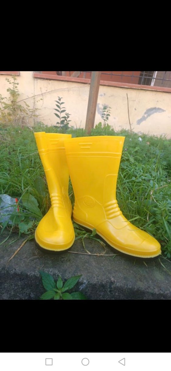 Erkekler için diz boyu, sarı lastik çizme. Düz, desen içermeyen tasarımıyla minimal ve sokak stiline uygun, rahat ve şık bir modeldir.