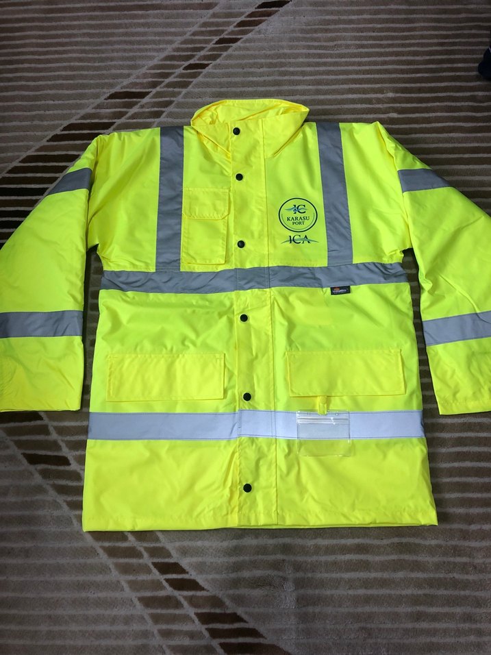 Uzun kollu, düğmeli ve reflektör şeritli erkek sarı iş montu. Yumuşak fleece kumaştan, normal kesim, yuvarlak yaka ve baskılı detaylara sahip, dış mekan için uygun.