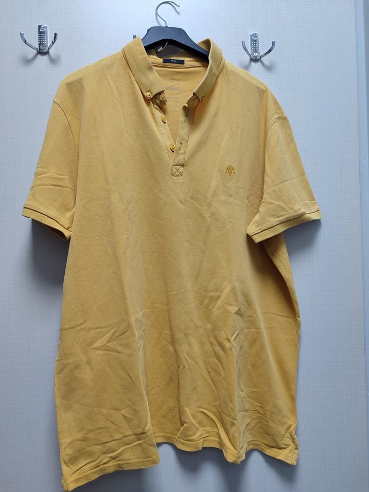 Sarı renk, kısa kollu, düğmeli ve yakalı erkek polo tişörtü. Sentetik parlak kumaştan, bol kesim ve günlük sokak giyimine uygun.