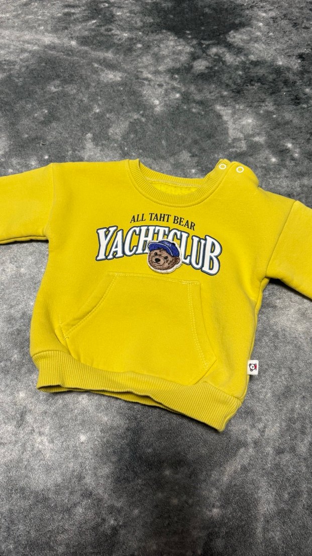 Sarı, uzun kollu, yuvarlak yakalı, renkli baskılı ve omuzda düğmeli, yumuşak ve sıcak kumaştan bol kesim erkek sweatshirt.