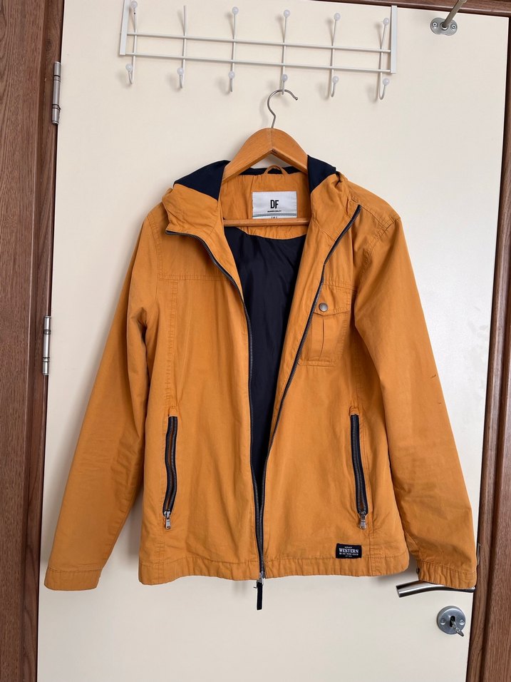 Sarı cep fermuarlı, notched yakalı, uzun kollu ve bol kesim erkek ceket. İnce mevsimlik ceket. Kolunda çok hafif lekeleri var.