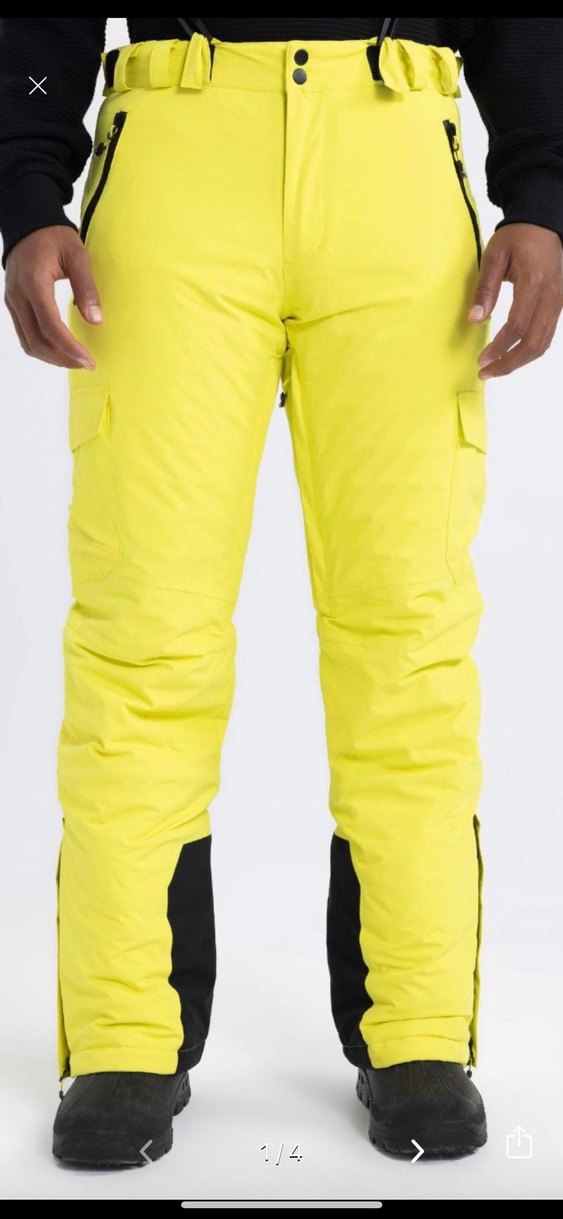 Parlak sarı renkte, kemerli ve dar kesim erkek kayak pantolonu. Sentetik kumaştan, normal boyda ve düz tasarımlı, dış mekan aktiviteleri için uygun. ⛷️
