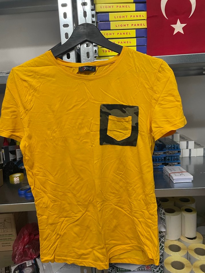 Sarı kısa kollu, bisiklet yaka tişört, koyu renk baskılı cep detayı, bol kesim ve kısa boy, rahat sokak stili için uygun.