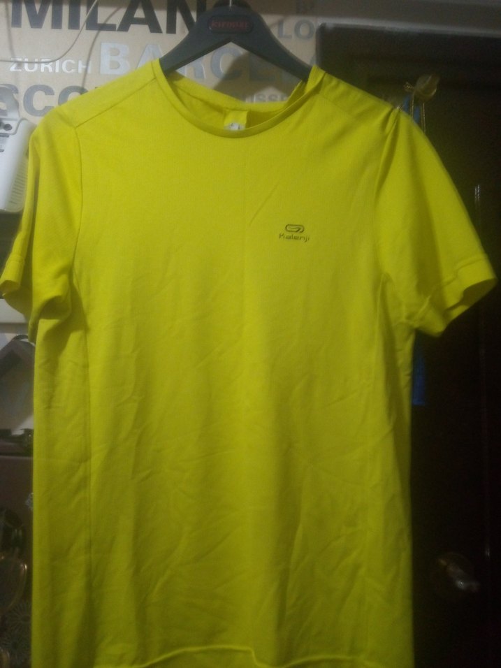 Erkekler için sarı kısa kollu, yuvarlak yakalı, normal boyda, göğüste küçük baskılı logo bulunan tişört. Spor ve sokak giyimi için uygun.