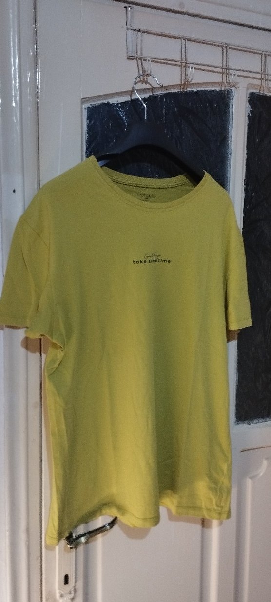 Erkekler için kısa kollu, bisiklet yaka ve bol kesim tişört. Yumuşak keten kumaştan, pastel sarı renkte ve küçük baskılı detaylı, rahat sokak stili sunar. Günlük kullanım için uygun.