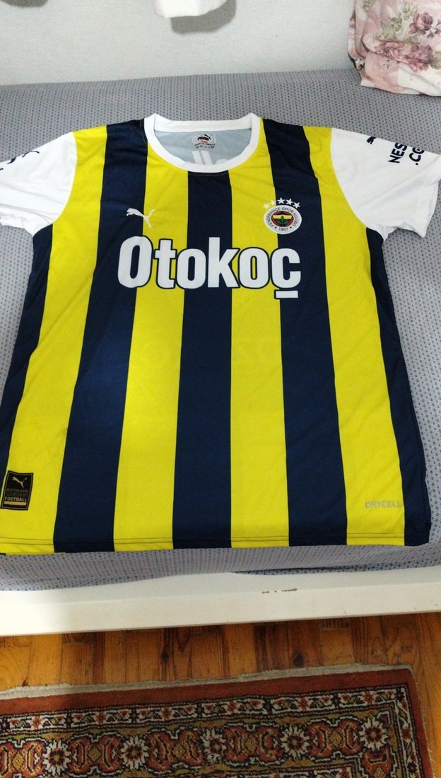 Erkekler için sarı ve lacivert dikey çizgili, kısa kollu, yuvarlak yaka ve yapışkan detaylı spor forması. 'Otokoc' baskılı, sentetik kumaştan üretilmiştir.
